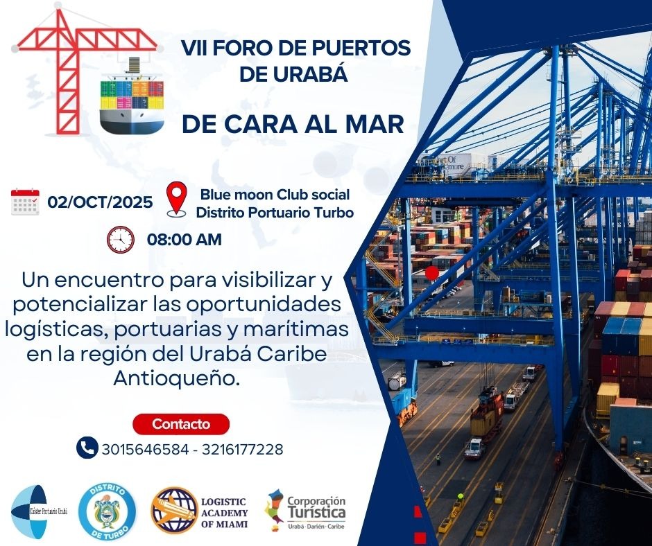 Te invitamos al VII Foro de Puertos de Urabá – De Cara al Mar, un espacio de encuentro para visibilizar y potenciar las oportunidades logísticas, portuarias y marítimas que impulsan el desarrollo de la región del Urabá Caribe Antioqueño.