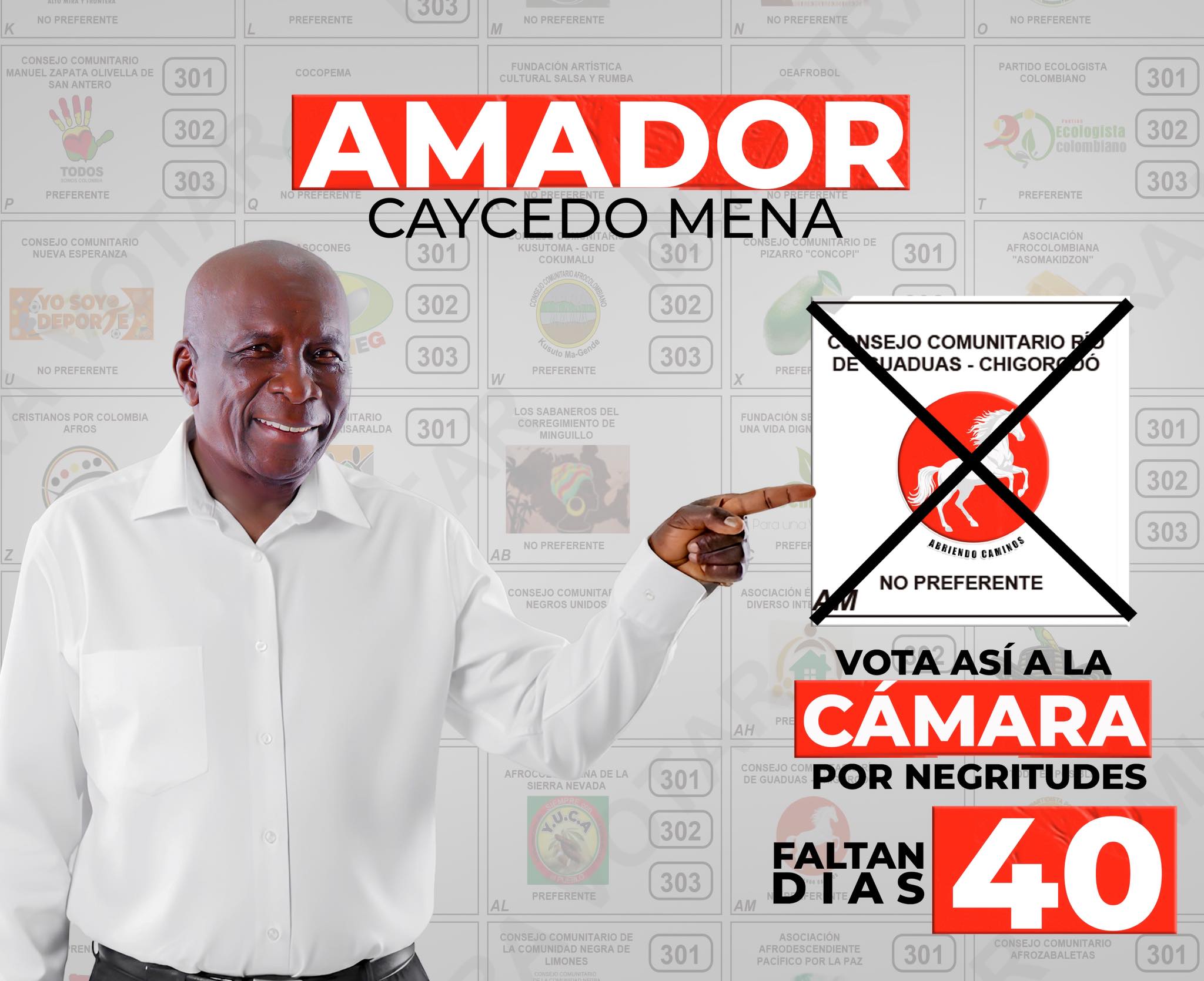 El exalcalde de Chigorodó, Amador Caicedo Mena, recorre el país con su propuesta política para llegar a la cámara de representantes por negritudes, el exconsul de Colombia en Panamá hace presencia en los departamentos del Chocó, Cauca, Antioquia, regiones con alta presencia de población afrodescendiente.
